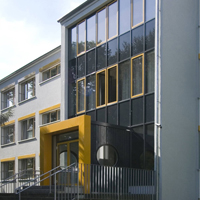 Die äußere Fassadengestaltung wird von einer zurückhaltenden, jedoch durch prägnante Einzelelemente bestimmten Farbhaltung bestimmt.