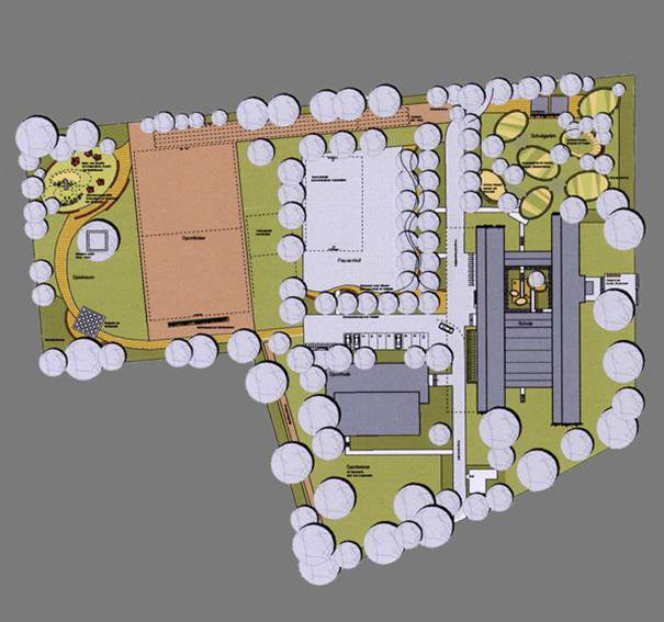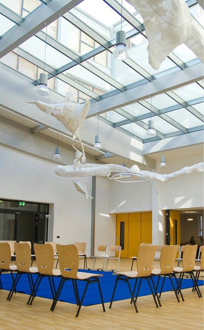 Im anderen offen verbliebenen Innenhof wurde ein teilverglaster Aufzug an das Hauptfoyer angeschlossen sowie ein "Grünes Klassenzimmer" eingeordnet.